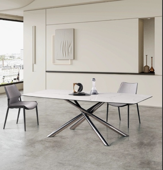 Na zdjęciu widoczny jest elegancki, nowoczesny stół o wyrafinowanym designie. Blat stołu wykonany jest z jasnego HPL imitującego marmur — ma gładką, błyszczącą powierzchnię z delikatnym żyłkowaniem w odcieniach beżu i szarości.