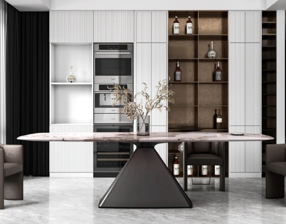 Możliwość zastosowania blatu dębowego, blatu szklanego, grafiki na szkle, HPL lub konglomeratu/spieku kwarcowego.