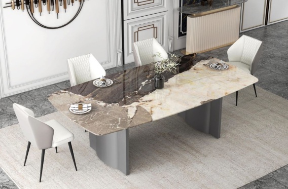 Na zdjęciu widoczny jest elegancki, nowoczesny stół o wyrafinowanym designie. Blat stołu wykonany jest z jasnego HPL  imitującego marmur — ma gładką, błyszczącą powierzchnię z delikatnym żyłkowaniem w odcieniach beżu i szarości.